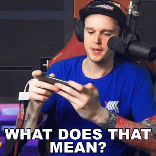 Pickles, wearing headphones and a blue shirt, looks confused while playing a game on his phone, asking 'What does that mean?'