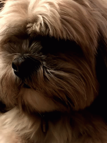 Close-up of a cute, fluffy dog's face with a collar, showing its nose and long fur.