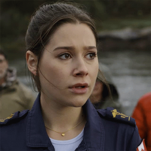 Natasha Calis as Hayley in Skymed, looking concerned with the on-screen text 'WHAT HAPPENED?'.