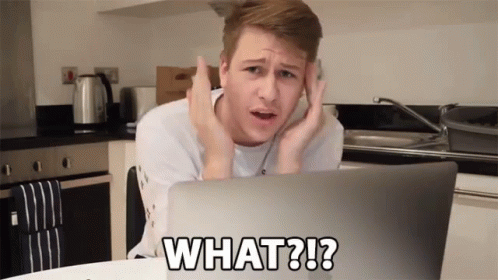 Slazo reacts with a shocked expression and exclaims 'WHAT?!?' while looking at something on his laptop.