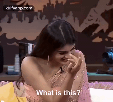 Nidhhi Agerwal reacts with amusement, covering her face while saying 'What is this?' on a couch.