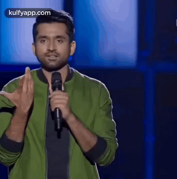 Aravind SA performing stand-up comedy, asking 'What is this?' on stage with a microphone.