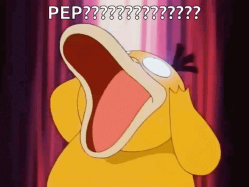 Psyduck screams with wide-open mouth, reacting to 'PEP' text in a moment of extreme surprise.
