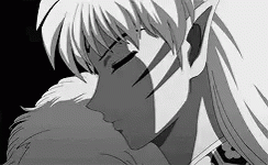 A black and white close-up of Sesshomaru from Inuyasha, showing a surprised or shocked expression.