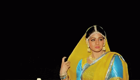 Legendary actress Sridevi gracefully poses in a vibrant yellow and blue saree with traditional Indian jewelry.