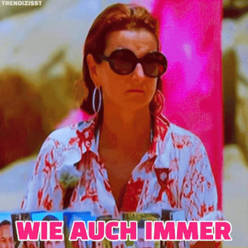 Claudia Obert, wearing sunglasses, says 'Wie auch immer' (Whatever) with a dismissive look.