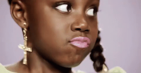 A little girl makes a sassy face, rolling her eyes and pursing her lips in a 'whatevs' expression.