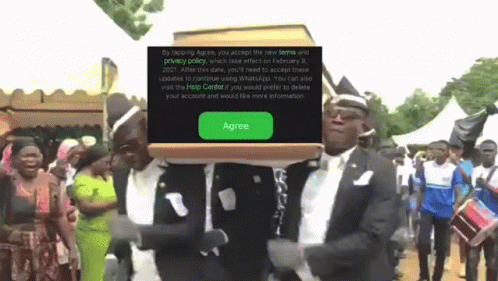 The Coffin Dance meme featuring Ghanaian pallbearers carrying a coffin with a WhatsApp privacy policy pop-up.
