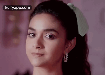 Keerthy Suresh's surprised reaction, wearing a bow in her hair and elegant earrings.