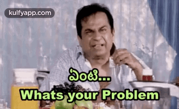 Indian comedian Brahmanandam asks 'What's your problem?' with an angry expression, holding a fork.