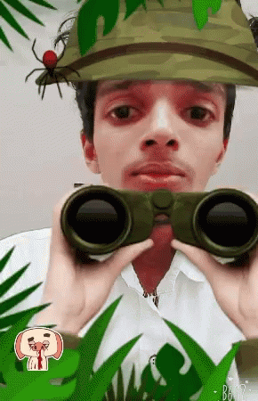 Man uses a fun WhatsApp filter, appearing as a jungle explorer with binoculars and a camouflage hat.