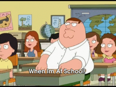 Peter Griffin from Family Guy in a classroom, humorously exclaiming 'When I'm At School!'
