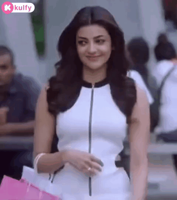 Kajal Aggarwal smiles charmingly while walking on the street, holding a pink shopping bag.