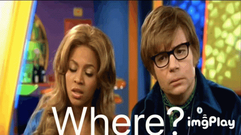Austin Powers and Foxxy Cleopatra look confused as the word "Where?" appears on screen.