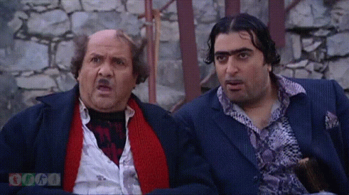 As'ad and another man make exaggerated whistling expressions in the Syrian comedy series Dayaa Dayaa.