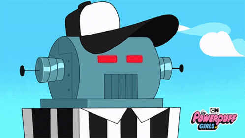 A robot referee from Las Chicas Superpoderosas (The Powerpuff Girls) blows a whistle, wearing a baseball cap.