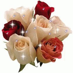 A beautiful bouquet of white, red, and saffron roses adorned with sparkling effects, creating a vibrant display.