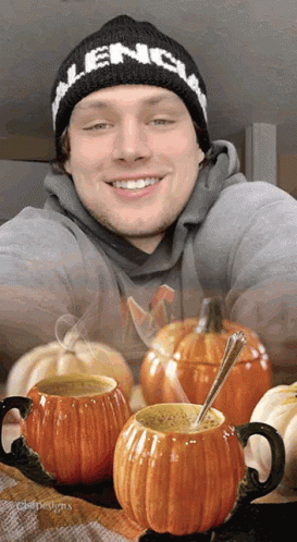 Whiteyy18 smiles brightly, wearing a Balenciaga hat, surrounded by steaming pumpkin-shaped coffee mugs and decorative pumpkins.
