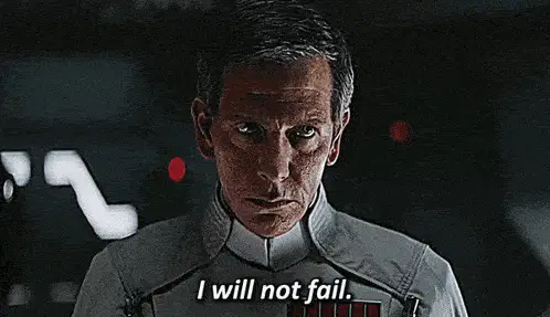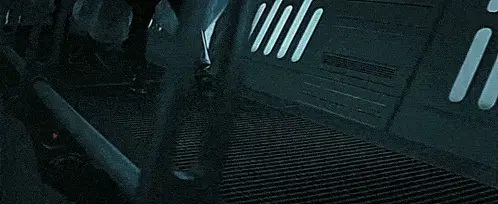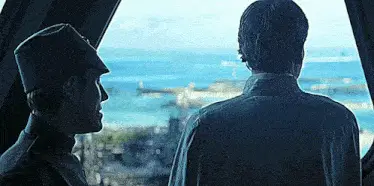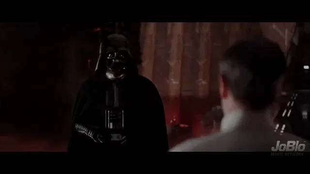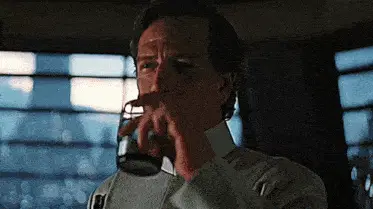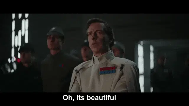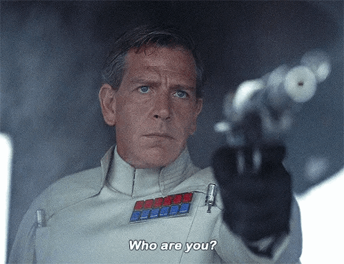 Director Orson Krennic, played by Ben Mendelsohn, points a blaster and demands 'Who are you?'