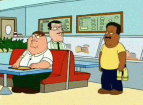 Peter Griffin, Cleveland Brown, and Dr. Hartman in a Family Guy scene where the proprietor is questioned.
