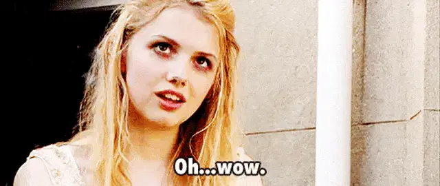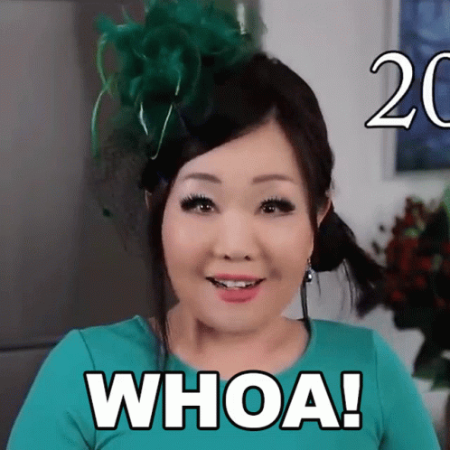 Emily Kim, also known as Maangchi, reacts with a surprised 'WHOA!' while wearing a green top and a feathered hair accessory.