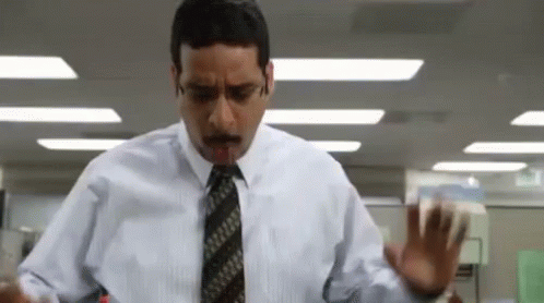 Erik Griffin exclaims 'Whoo!' with hands raised in an office, full of excitement and joy.