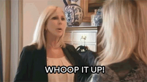 Vicki Gunvalson enthusiastically exclaims 'Whoop It Up!' while raising her arm.