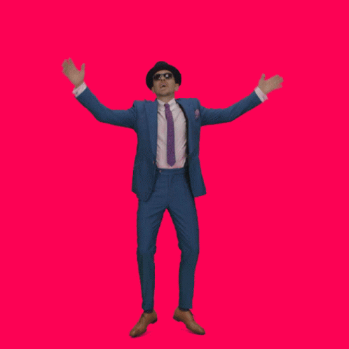 Jan Delay in a blue suit, hat, and sunglasses, energetically dancing with arms raised against a pink background.