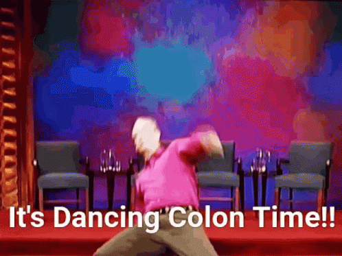 Colin Mochrie in a pink shirt enthusiastically dancing on stage with the caption 'It's Dancing Colon Time!!'