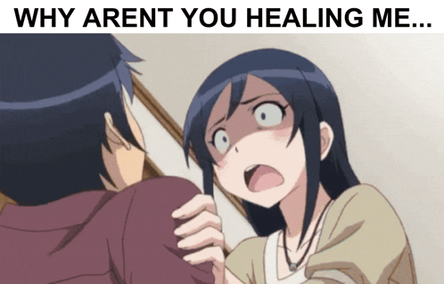 An anime character looks shocked with the text 'WHY ARENT YOU HEALING ME...' reflecting a gaming frustration.