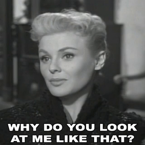 Dolores Carter in a black and white scene, asking 'Why Do You Look At Me Like That?' with a questioning gaze.