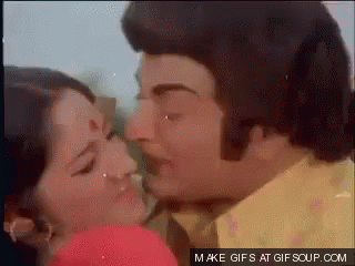 Kii and a woman share a passionate kiss in a classic film scene, captured in a wide awake moment.