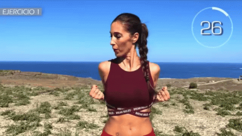 Susana Yabar demonstrates a wide arm stretch exercise outdoors with a beautiful sea view under a clear sky.
