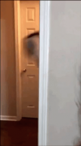 White mannequin head peeks from doorframe, quickly retracts in a jump scare prank.