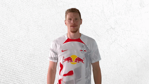 Marcel Halstenberg, wearing an RB Leipzig jersey, wiggles his fingers playfully for the camera.