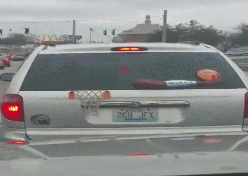 A silver minivan features a mini basketball hoop attached to its rear, with a 'Wildcats' basketball on the wiper.