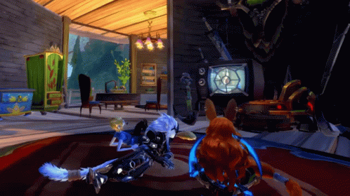 Two Wildstar Aurin characters, a blue fox-like one and a reddish-brown one, relaxing and watching TV in a cozy room.