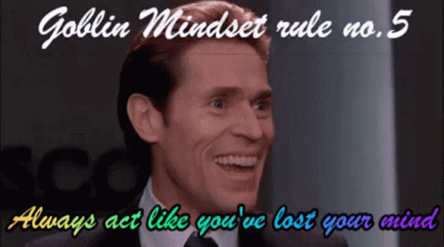 Willem Dafoe embodies 'Goblin Mindset rule no. 5: Always act like you've lost your mind' with an intense expression.