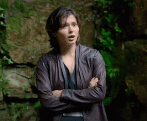 Ruby Cruz as Kit Tanthalos from Willow TV Series, looking shocked and surprised with arms crossed.