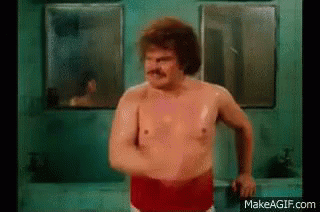 Jack Black as Nacho Libre flexing his muscles in a bathroom scene from the movie.