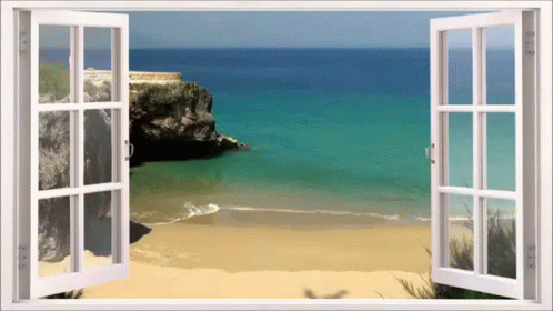 A beautiful view of a sandy beach and turquoise ocean through an open window, with a 'Good morning' greeting.