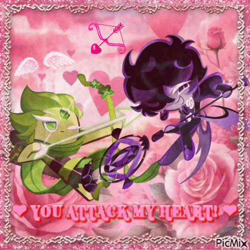 Wind Archer Cookie and Black Sapphire Cookie in a romantic fan art with 'YOU ATTACK MY HEART!' text.
