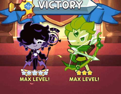 Black Sapphire Cookie and Wind Archer Cookie celebrate victory at max level in Cookie Run Kingdom.