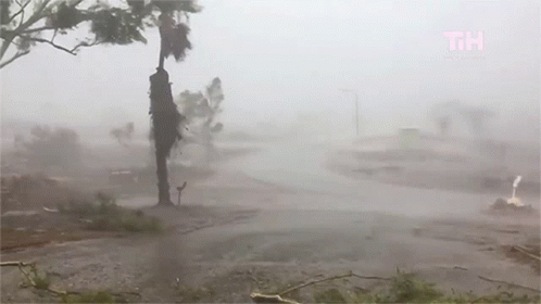 Trees bending violently in strong winds and heavy rain during a severe storm, creating a chaotic and misty environment.