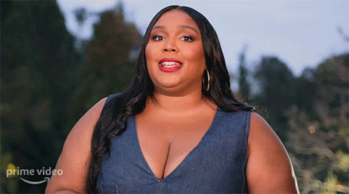 Lizzo winks playfully at the camera, wearing a blue dress, with the Prime Video logo visible.