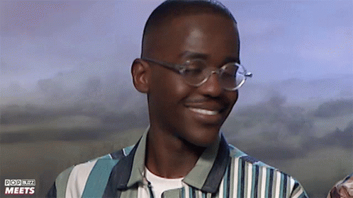 Ncutti Gatwa, wearing glasses and a striped shirt, smiles charmingly and gives a playful wink.