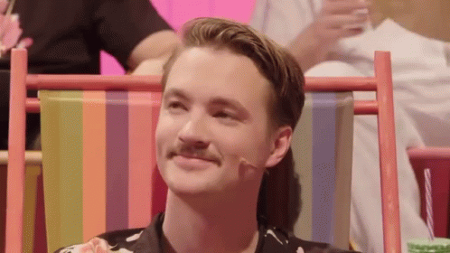 Bram Krikke, a young man with a mustache, gives a playful wink while sitting in a striped chair.