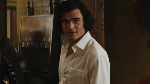 Elton John, portrayed in Rocketman, gives a seductive wink while standing by a soda machine.