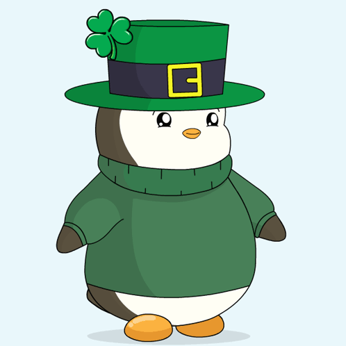An animated chubby penguin in a green sweater winks while holding a green flag, celebrating St. Patrick's Day.