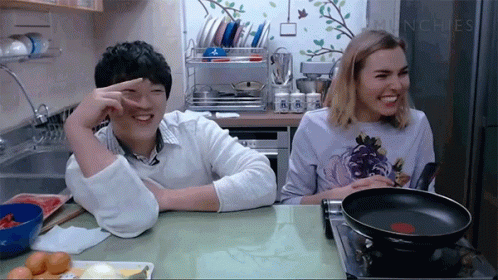 A man and a woman laugh, wink, and pose for the camera during a Munchies Mukbang session.